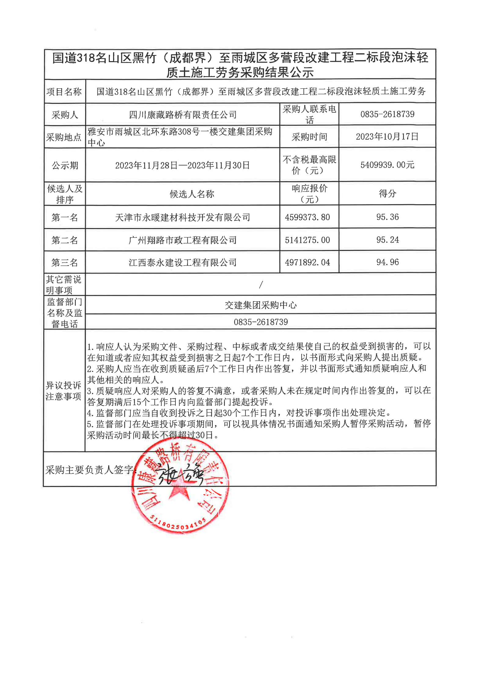 四川康藏路桥有限责任公司国道318名山区黑竹(成都界)至雨城区多营段改建工程二标段泡沫轻质土施工劳务采购结果公示