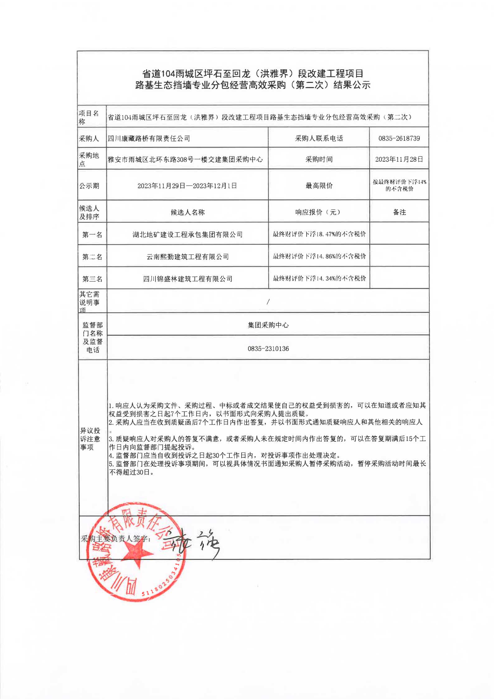 四川康藏路桥有限责任公司省道104雨城区坪石至回龙(洪雅界)段改建工程项目路基生态挡墙专业分包经营高效采购(第二次)结果公示
