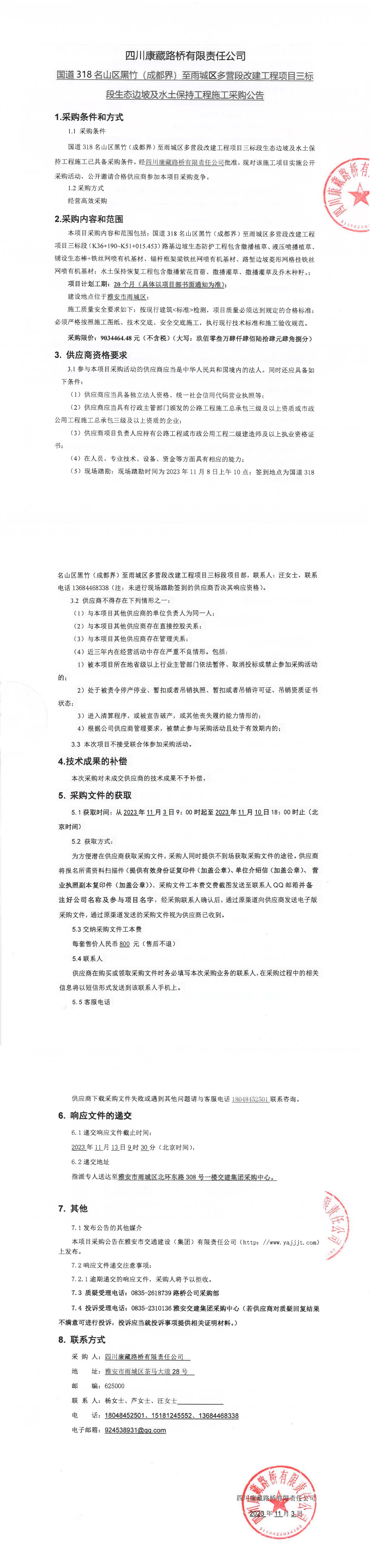 四川康藏路桥有限责任公司国道318名山区黑竹(成都界)至雨城区多营段改建工程项目三标段生态边坡及水土保持工程施工采购公告