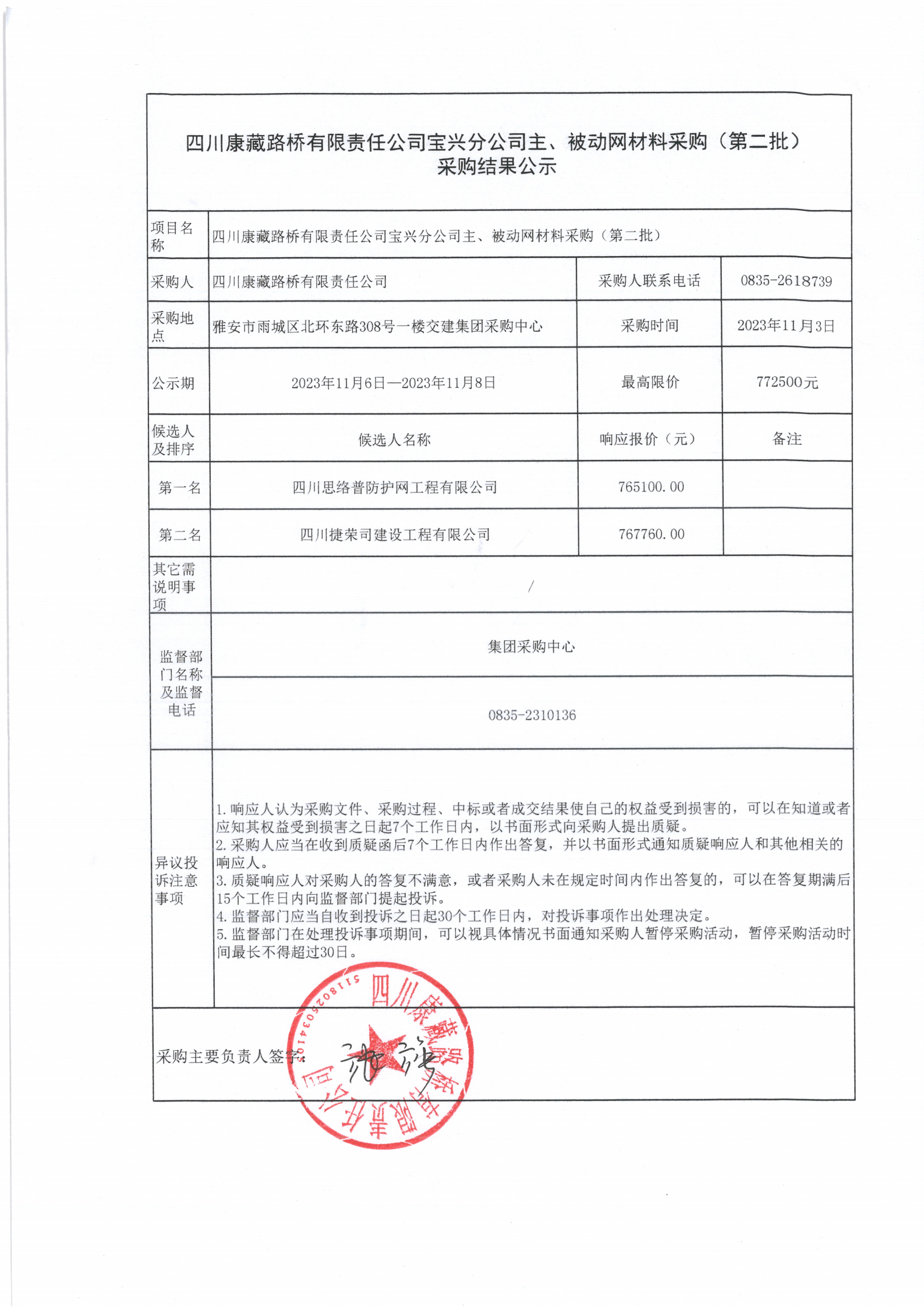 四川康藏路桥有限责任公司宝兴分公司主、被动网材料采购(第二批)采购结果公示