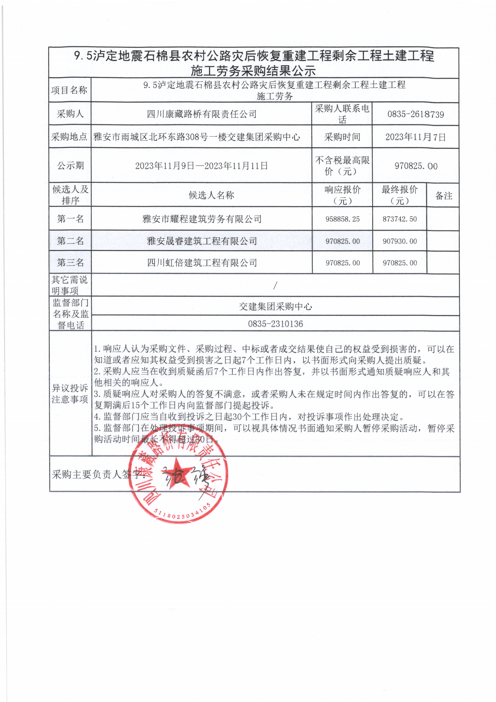 四川康藏路桥有限责任公司9.5泸定地震石棉县农村公路灾后恢复重建工程剩余工程土建工程施工劳务采购结果公示