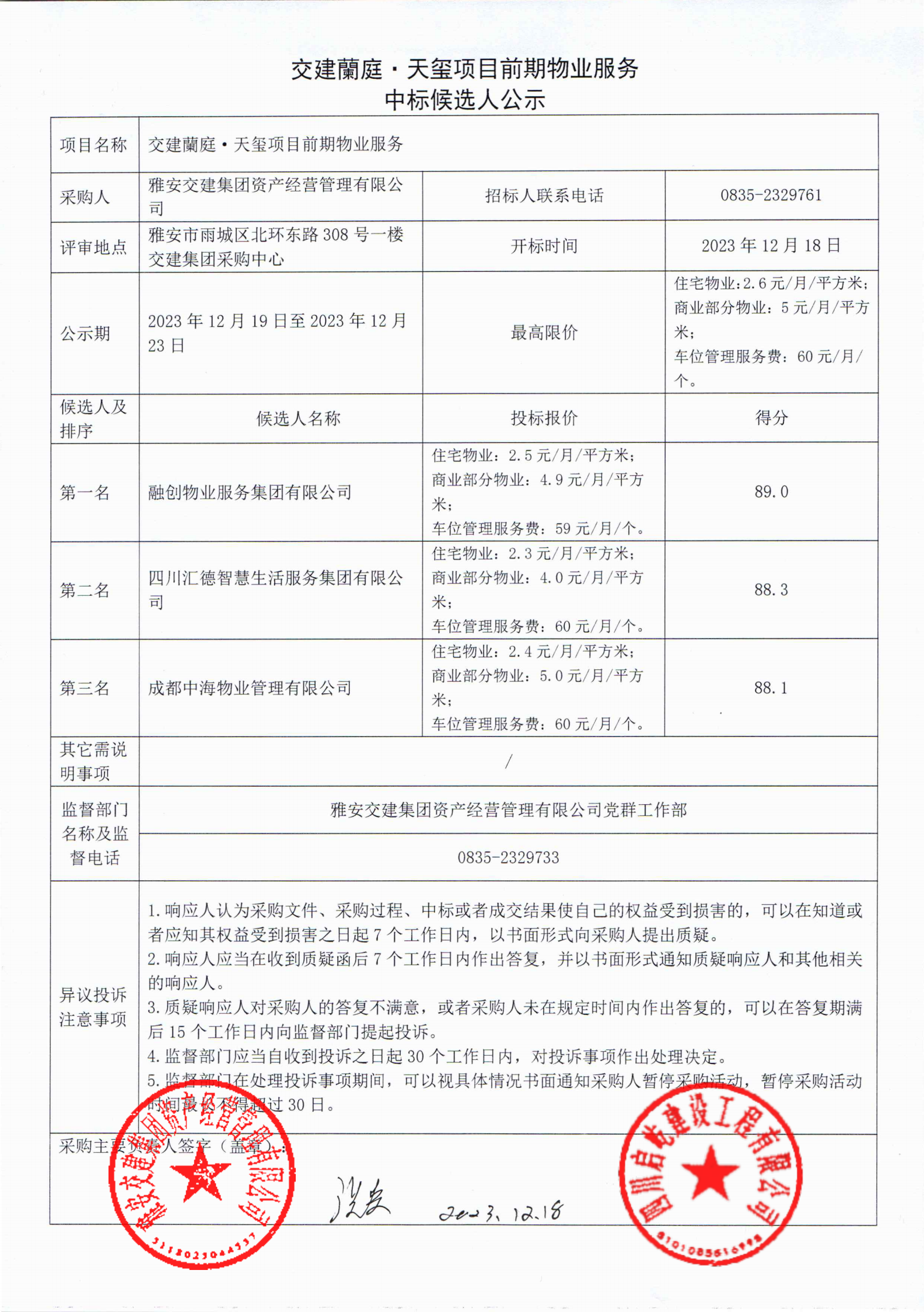 大红鹰dhy(中国)集团资产经营管理有限公司交建蘭庭·天玺项现在期物业服务中标候选人公示