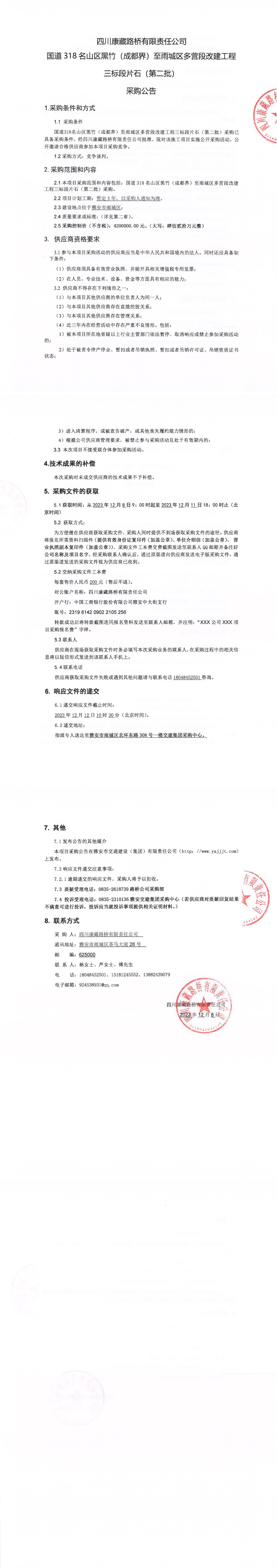 四川康藏路桥有限责任公司国道318名山区黑竹(成都界)至雨城区多营段改建工程三标段片石(第二批)采购公告