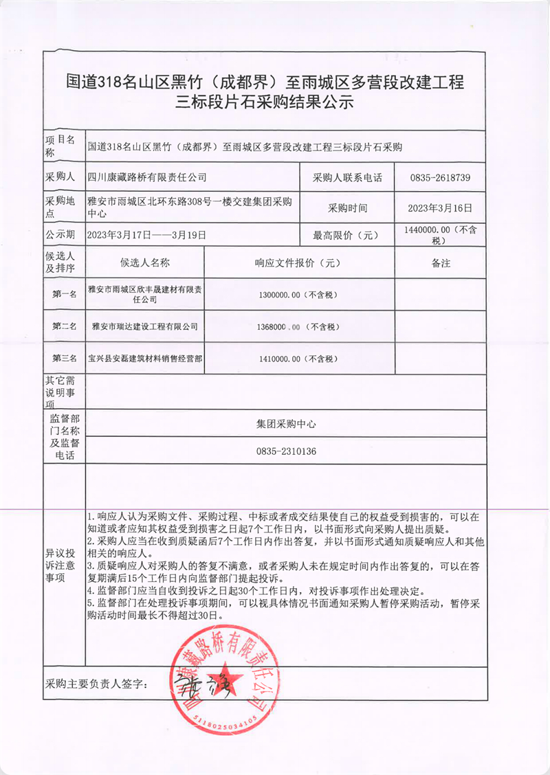 四川康藏路桥有限责任公司国道318名山区黑竹(成都界)至雨城区多营段改建工程三标段片石采购结果公示