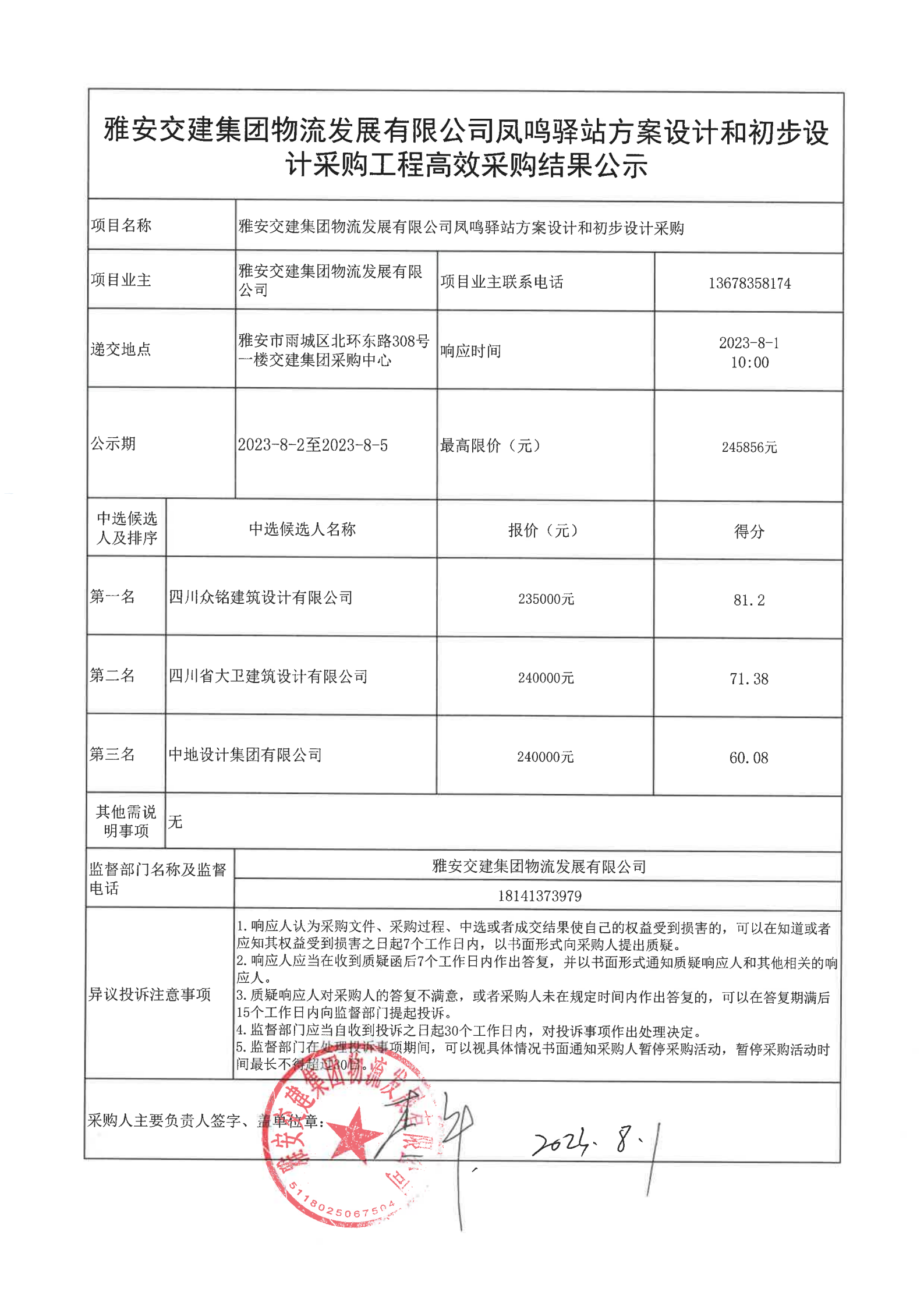 大红鹰dhy(中国)集团物流开展有限公司凤鸣驿站方案设计和初步设计采购工程高效采购结果公示