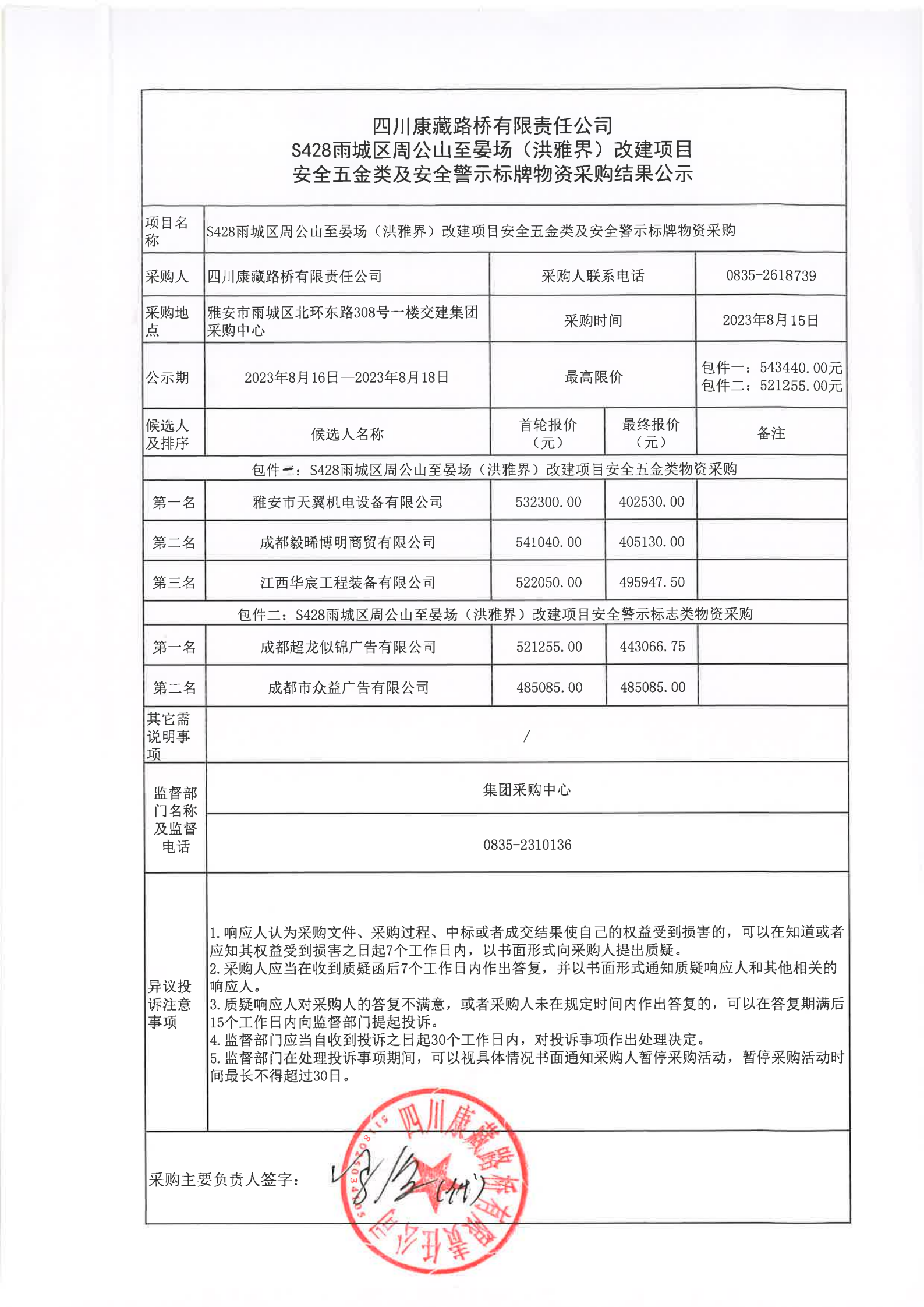 四川康藏路桥有限责任公司S428雨城区周公山至晏场(洪雅界)改建项目安全五金类及安全警示标牌物资采购结果公示