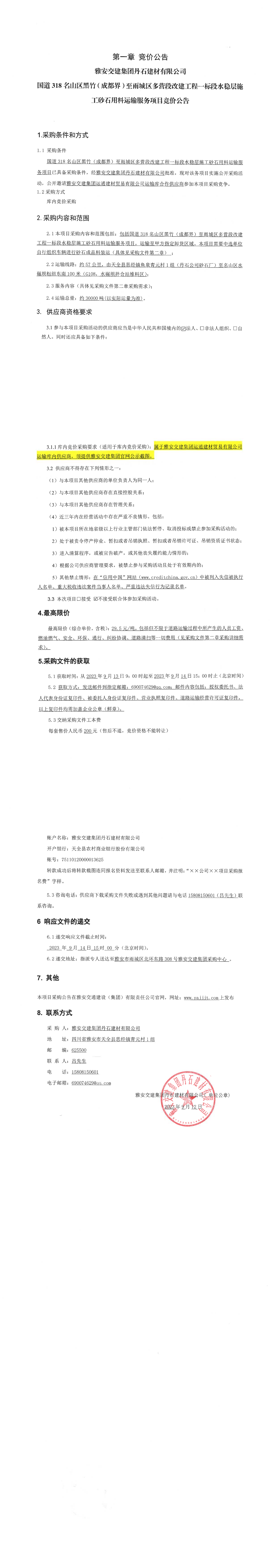 大红鹰dhy(中国)集团丹石建材有限公司国道318名山区黑竹(成都界)至雨城区多营段改建工程一标段水稳层施工砂石用料运输服务项目竞价公告