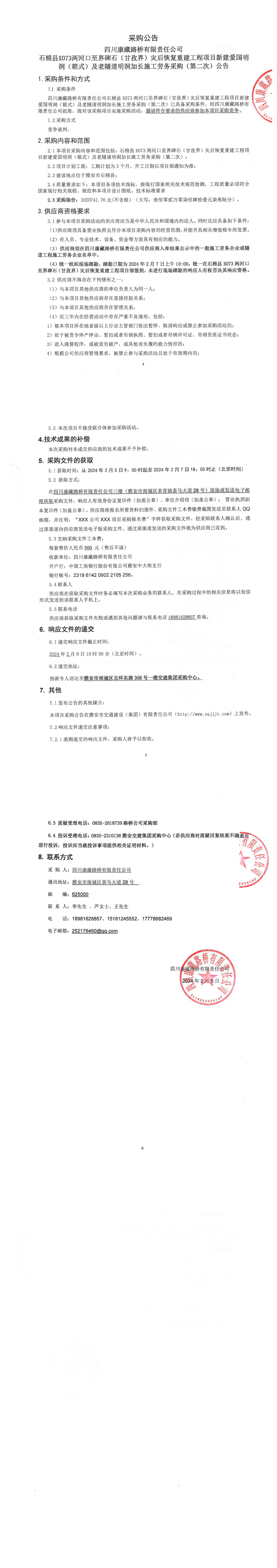 四川康藏路桥有限责任公司石棉县X073两河口至界碑石(甘孜界)灾后恢复重建工程项目新建爱国明洞(箱式)及老隧道明洞加长施工劳务采购(第二次)公告