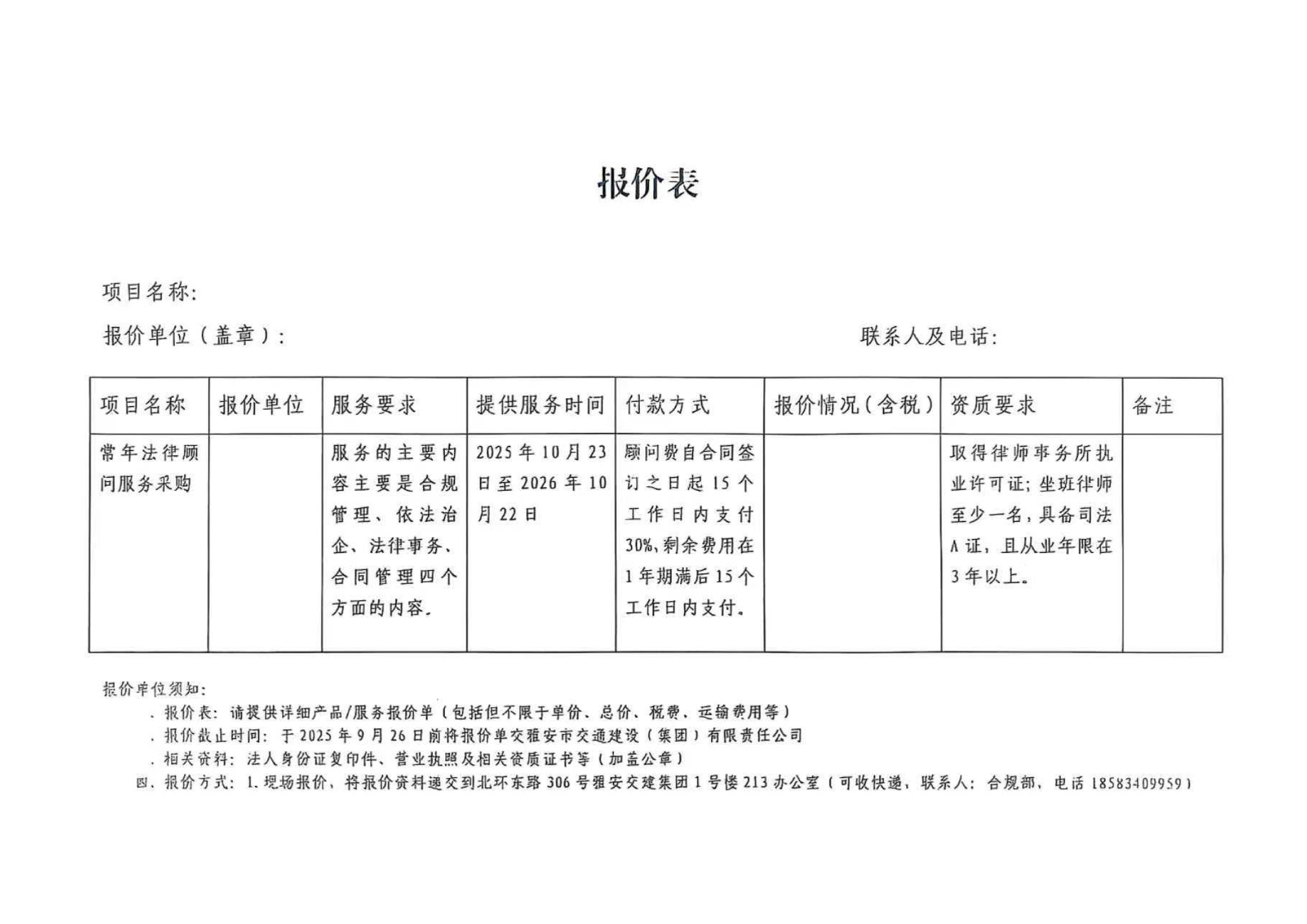 关于雅安市交通建设(集团)有限责任公司常年法律顾问服务的询价函