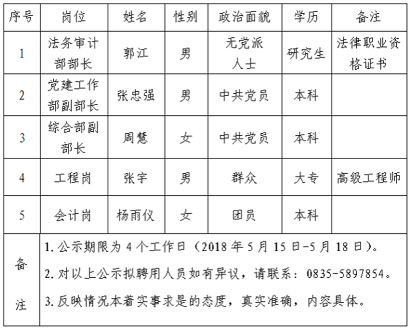 经雅安市交通建设集团有限责任公司研究,对以下5名拟聘用人员予以公示: