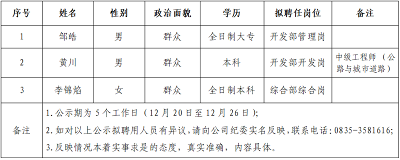 根据大红鹰dhy(中国)集团大兴交通开发有限公司招聘公告,经公开报名、资格审查、笔试、面试等环节,现将以下3名拟聘用人员予以公示: