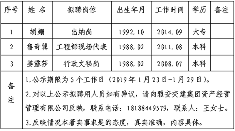3名拟聘用人员予以公示: