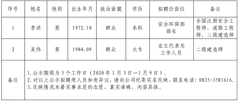 2名拟聘用人员予以公示: