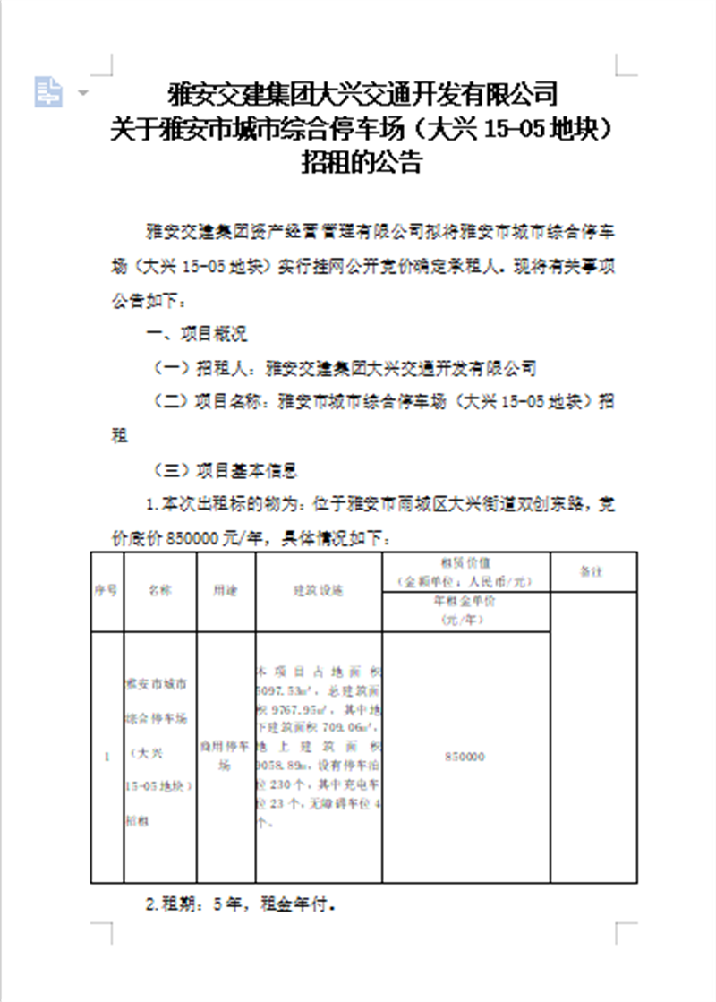 大红鹰dhy(中国)集团大兴交通开发有限公司关于雅安市城市综合停车场(大兴15-05地块)招租的公告