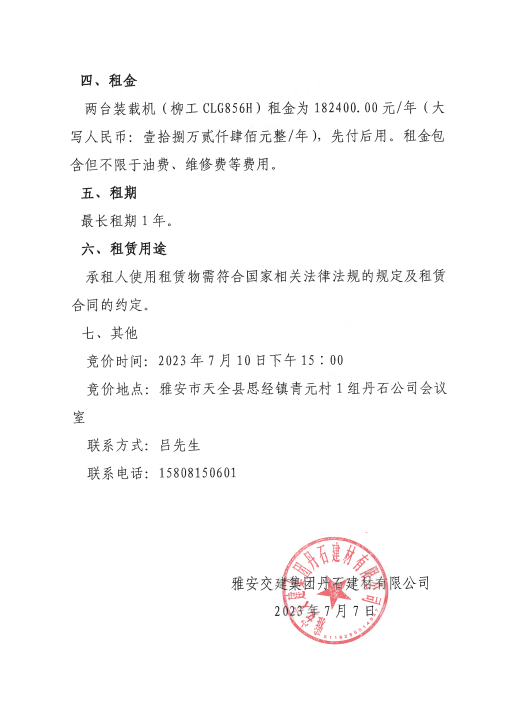 大红鹰dhy(中国)集团丹石建材有限公司关于2台装载机公开招租的公告附件