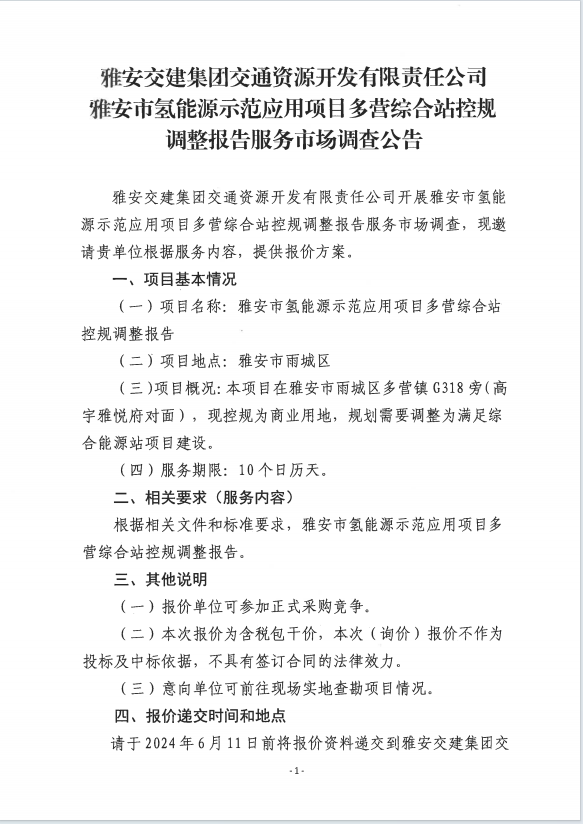 大红鹰dhy(中国)集团交通资源开发有限责任公司雅安市氢能源示范应用项目多营综合站控规调整报告服务市场调查公告