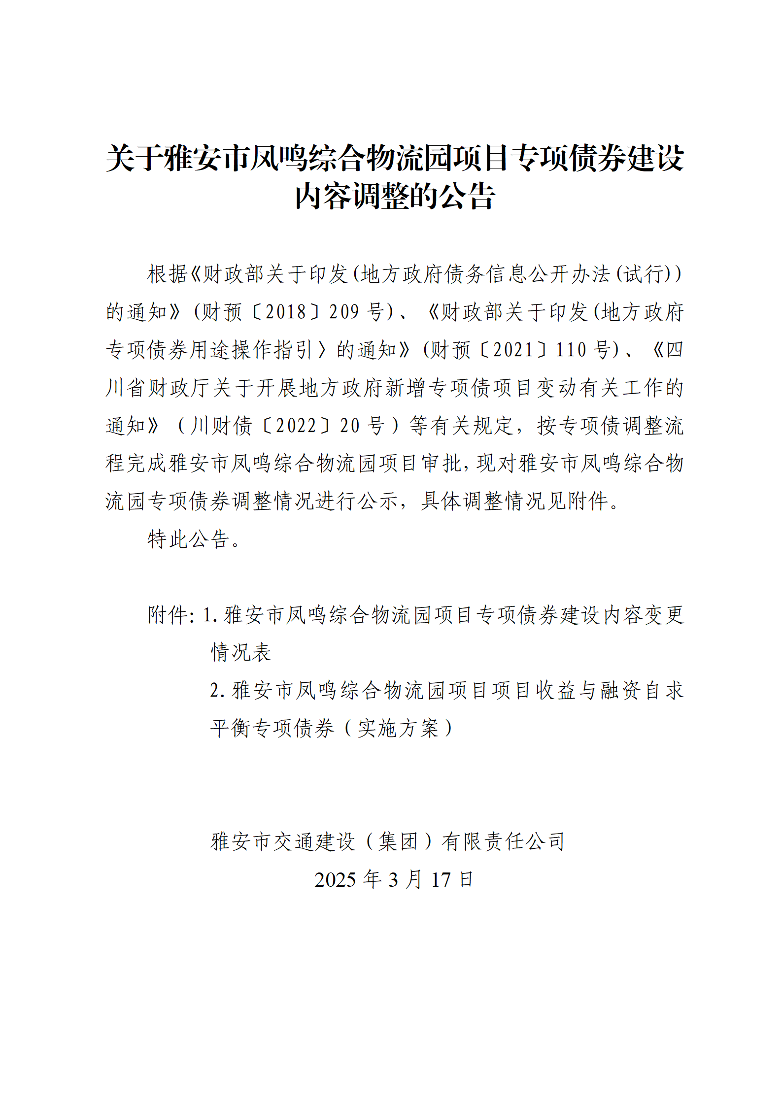 关于雅安市凤鸣综合物流园项目专项债券建设内容调整的公告