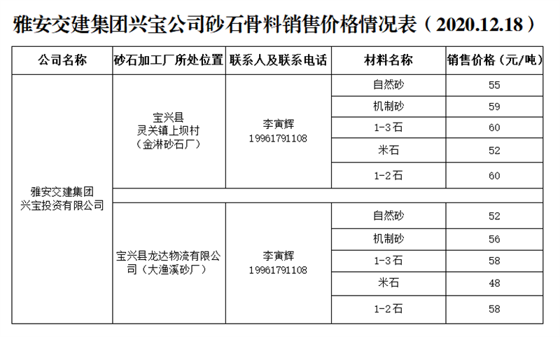 大红鹰dhy(中国)集团兴宝公司砂石骨料销售价格情况表(2020.12.18)