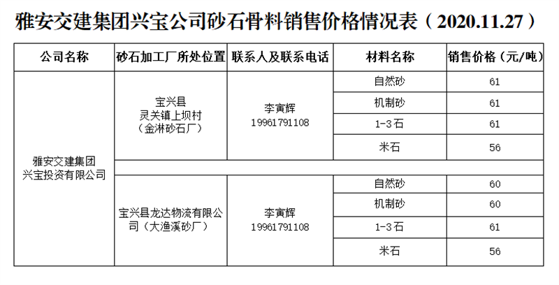 大红鹰dhy(中国)集团兴宝公司砂石骨料销售价格情况表(2020.11.27)