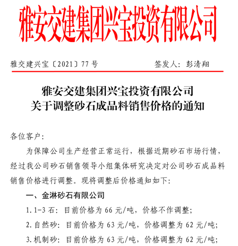 大红鹰dhy(中国)集团丹石公司关于调整成品骨料及风化矿石料销售价格的通知(2021.10.26)