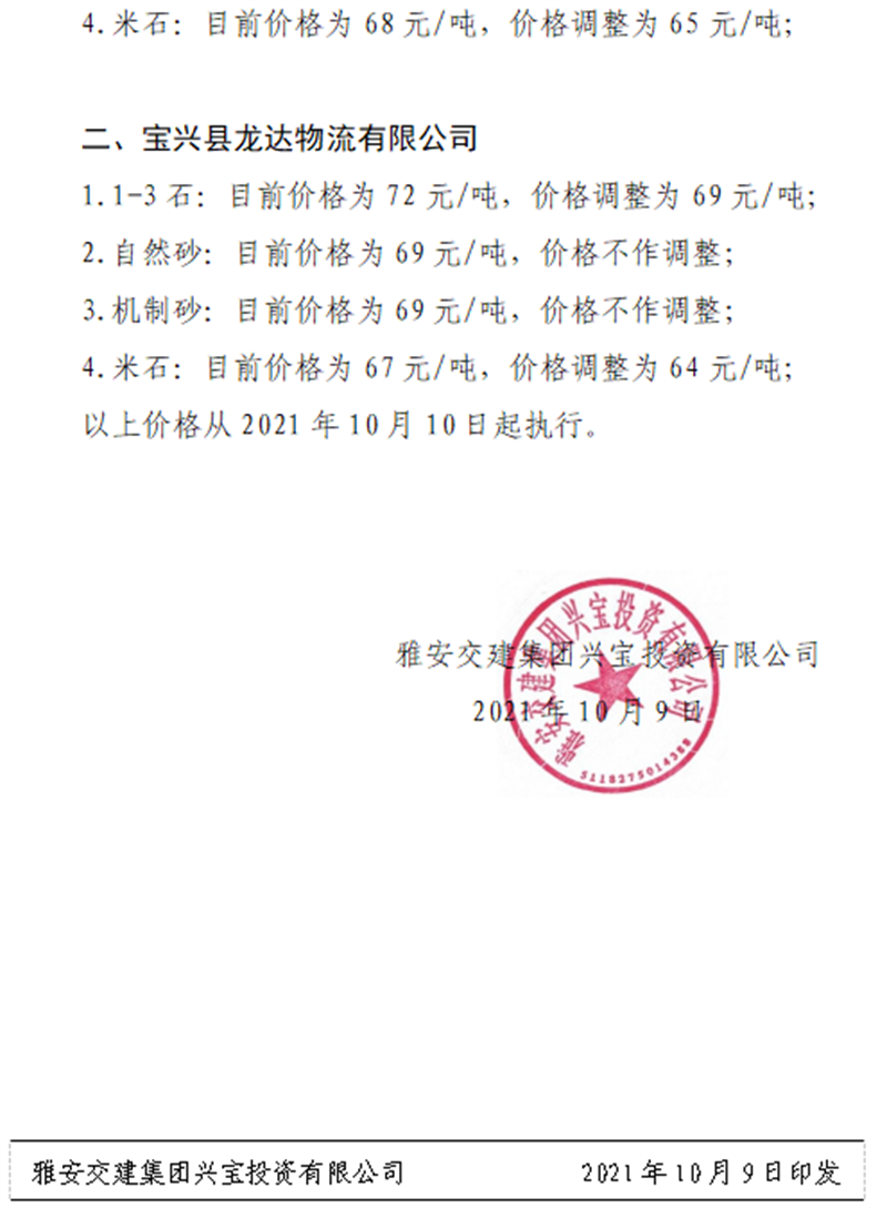大红鹰dhy(中国)集团兴宝公司关于调整砂石成品料销售价格的通知(2021.9.28)