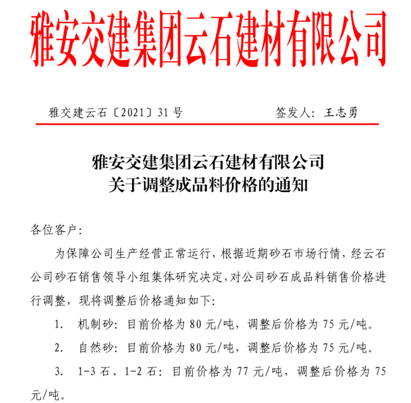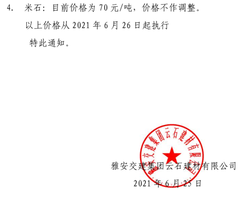 大红鹰dhy(中国)集团云石公司砂石骨料销售价格情况表(2021.7.12)