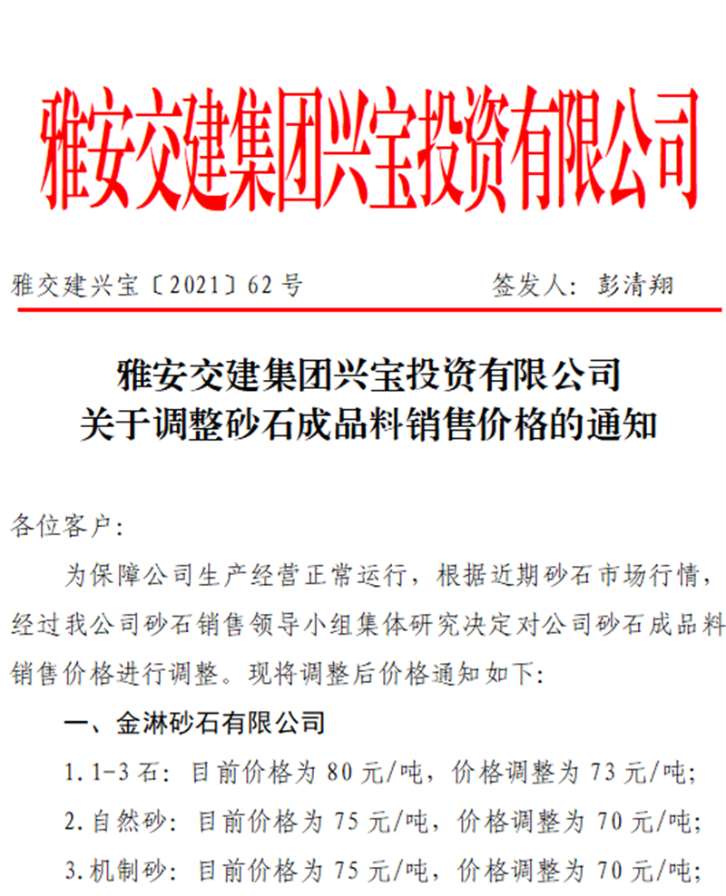 大红鹰dhy(中国)集团兴宝公司关于调整砂石成品料销售价格的通知(2021.9.28)