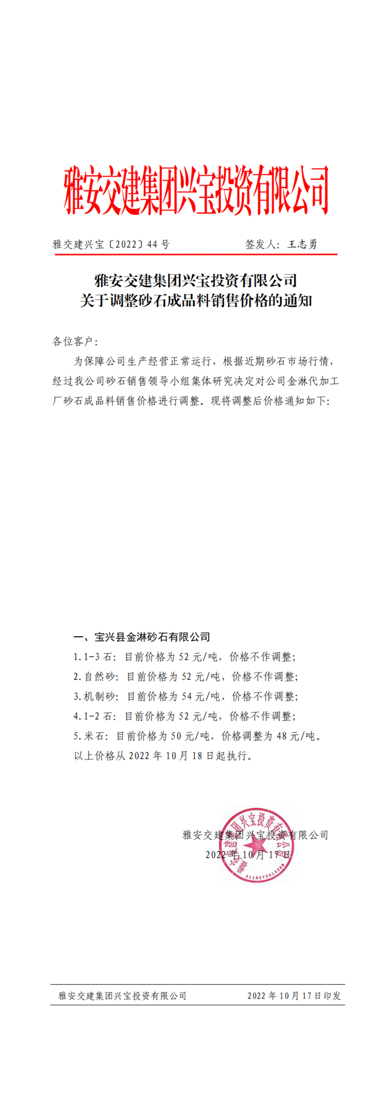 雅交建兴宝〔2022〕44号 关于调整砂石成品料销售价格的通知10.17
