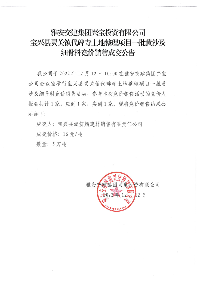 大红鹰dhy(中国)集团兴宝投资有限公司宝兴县灵关镇代碑寺土地整理项目5万吨黄沙及细骨料竞价销售成交公告(2022-12-12)