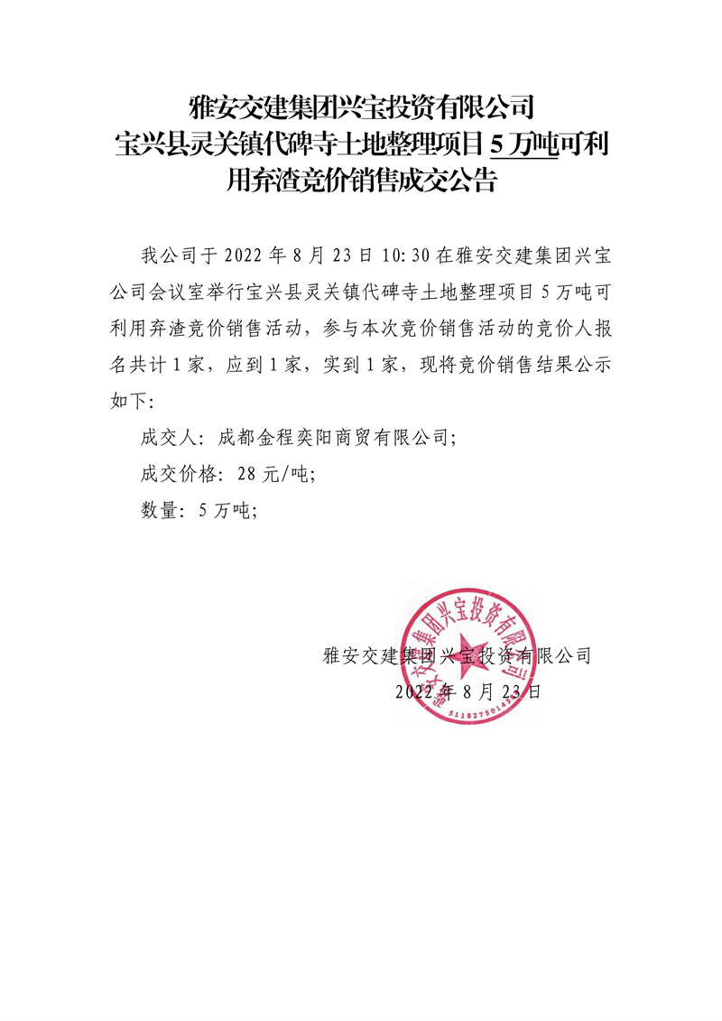 大红鹰dhy(中国)集团兴宝投资有限公司宝兴县灵关镇代碑寺土地整理项目5万吨可利用弃渣竞价销售成交公告(8.23)
