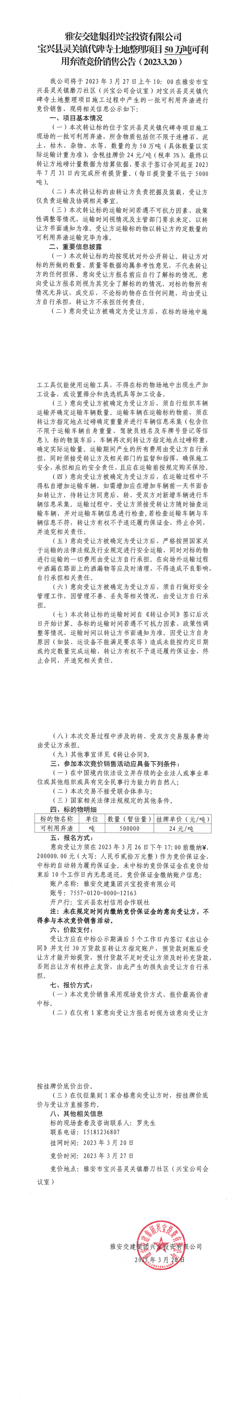 大红鹰dhy(中国)集团兴宝投资有限公司代碑寺土地整理项目50万吨可利用弃渣竞价销售公告(2023.3.20)