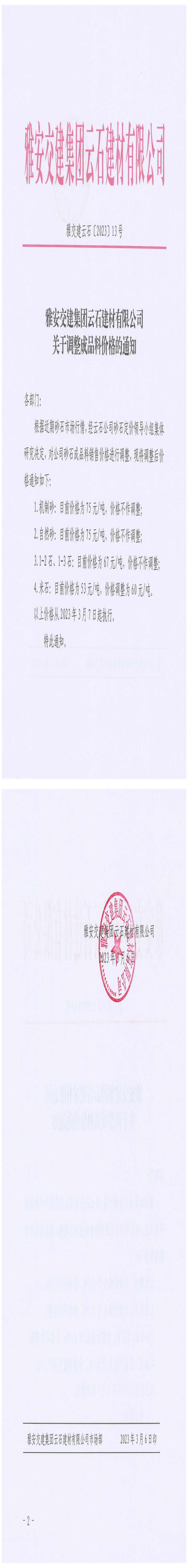大红鹰dhy(中国)集团云石建材有限公司关于调整成品料价格的通知-2023-03-06